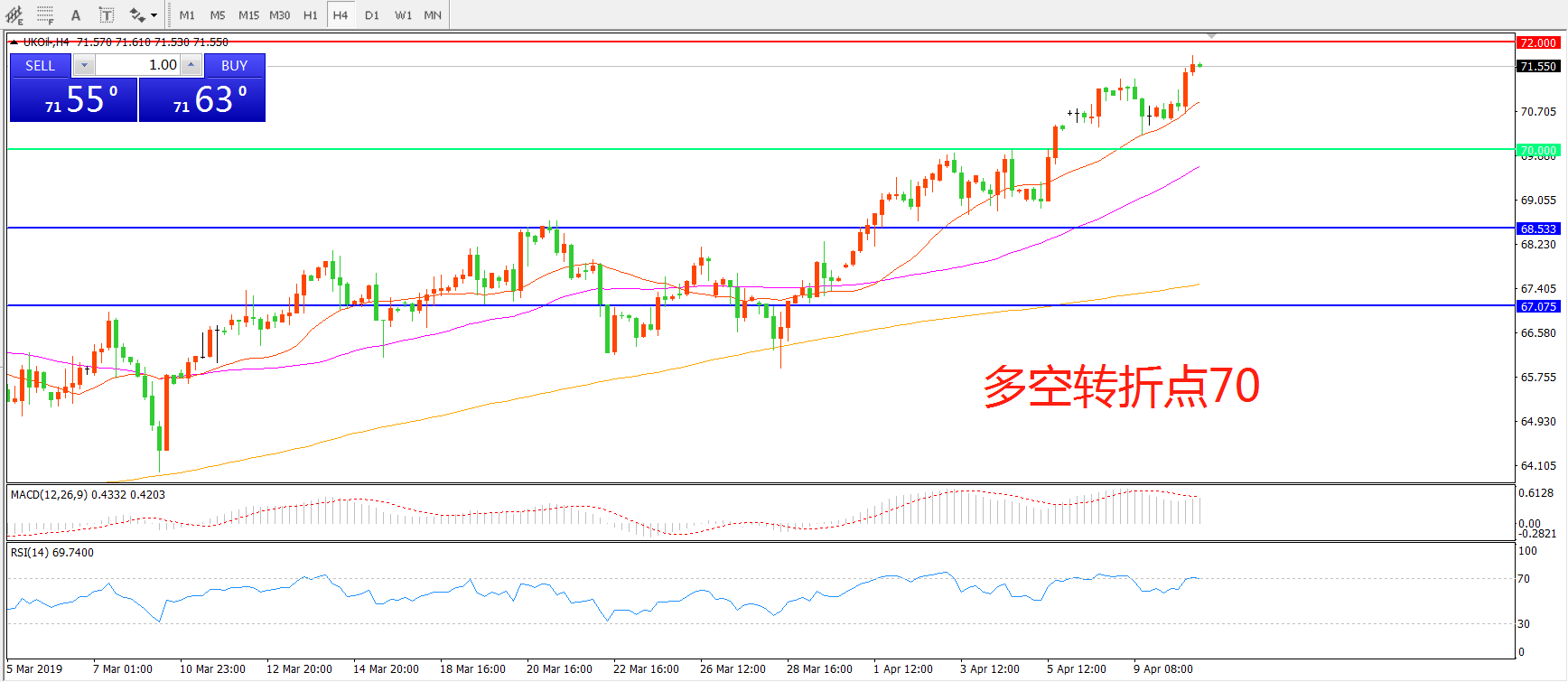 周三,美国能源信息署EIA报告显示,美国4月5日当周原油库存增加702.9万桶,高于预期的增加250万桶,创2017年11月份以来新高。但汽油库存减少771万桶, OPEC发布月报显示,受美国制裁以及电力故障的影响,委内瑞拉3月原油产量已经降至长期新低,这令全球原油供应进一步下滑。抵消了原油库存数据的利空影响。布油窄幅震荡后上行,收报71.55美元/桶。