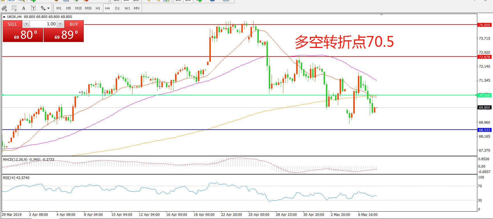 交易策略:在70.50   之下看跌,目标68.50    66.00