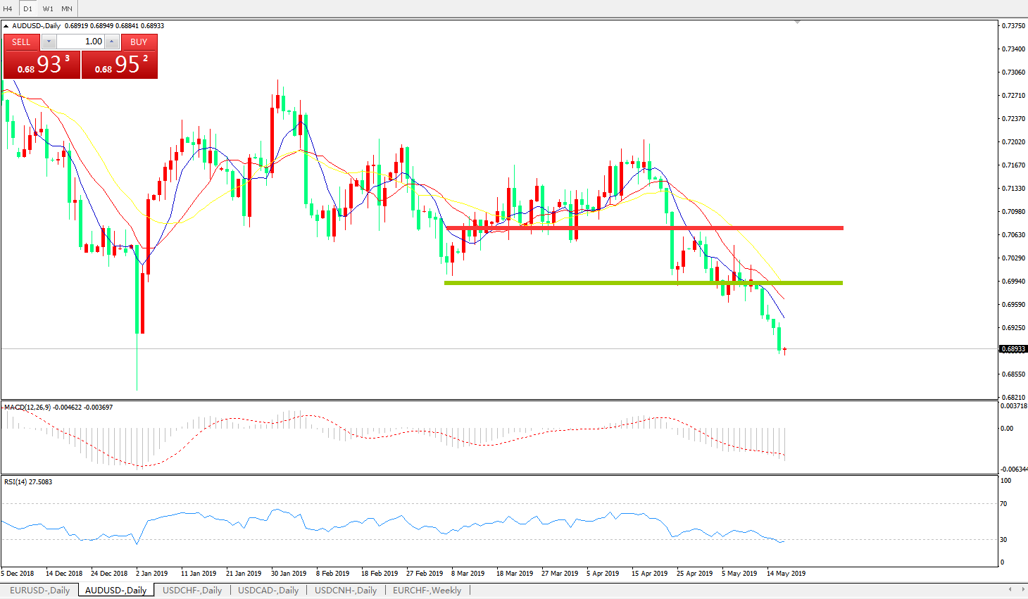 技术面简析:日图均线有序空头排列看跌,汇价持续走低,须谨防超跌反弹,MACD下穿0轴且动能柱0轴下方加速放量,RSI缓步走低,预计汇价大概率将进一步下行。