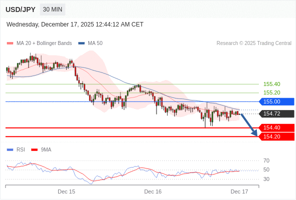 在 155.00 之下,看跌,目标价位为 154.40 ,然后为 154.20 。