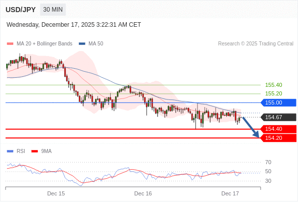 在 155.00 之下,看跌,目标价位为 154.40 ,然后为 154.20 。