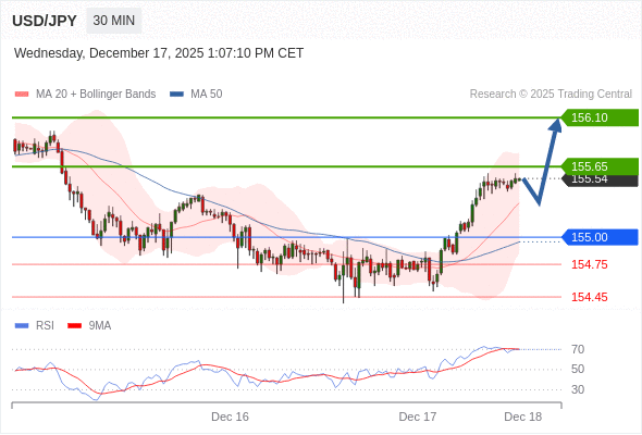 在 154.75 之上,看涨,目标价位为 155.65 ,然后为 156.10 。