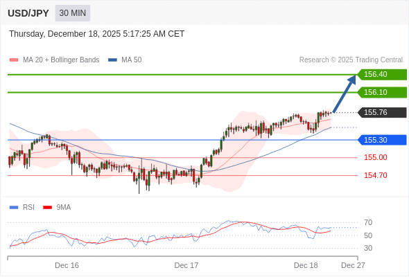 在 155.30 之上,看涨,目标价位为 156.10 ,然后为 156.40 。