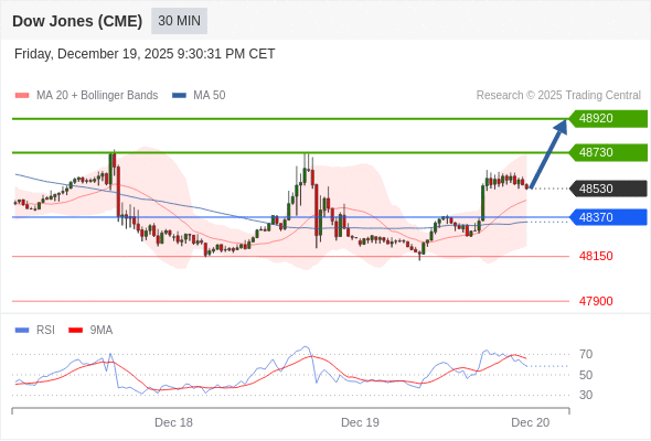 在 48370 之上,看涨,目标价位为 48730 ,然后为 48920 。