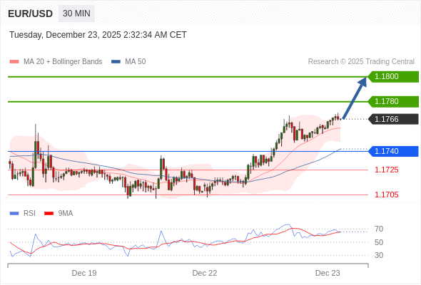 在 1.1740 之上,看涨,目标价位为 1.1780 ,然后为 1.1800 。