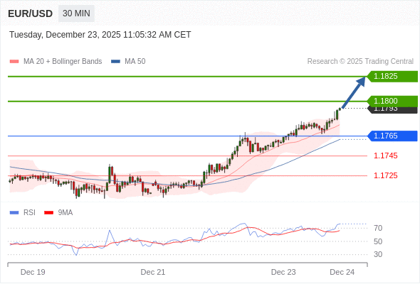 在 1.1765 之上,看涨,目标价位为 1.1800 ,然后为 1.1825 。