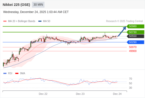 日经225股指期货 (OSE) 当日内: 在50290之上,看涨。