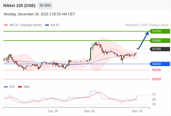 在 50430 之上,看涨,目标价位为 50980 ,然后为 51200 。