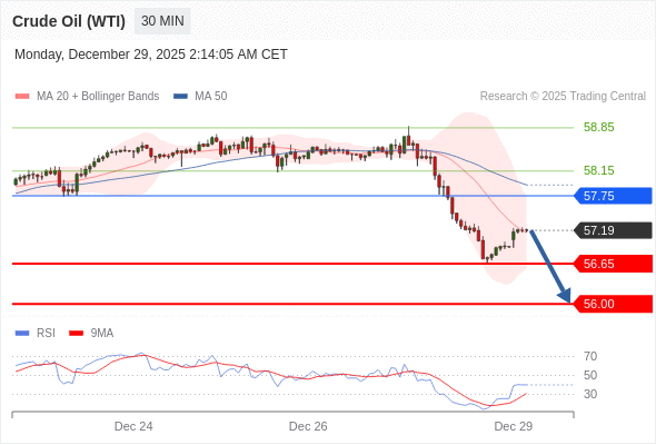 交易策略: 在 57.75 之下,看跌,目标价位为 56.65 ,然后为 56.00 。