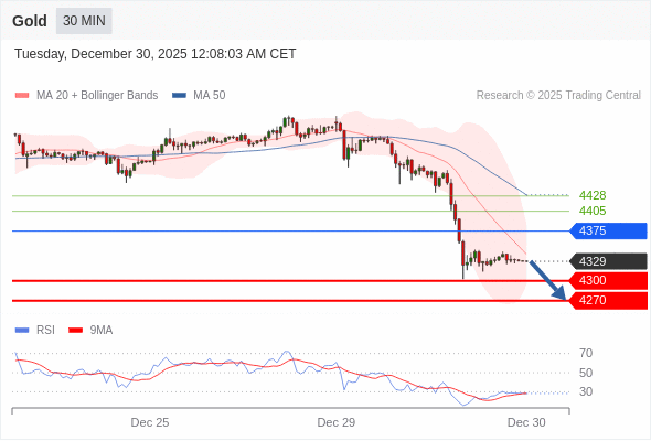 在 4375 之下,看跌,目标价位为 4300 ,然后为 4270 。