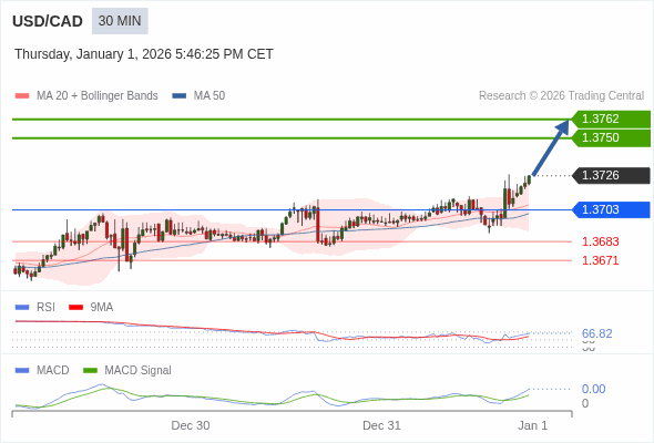 美元/加元 当日内 : 看涨,当 1.3703 为支撑位。