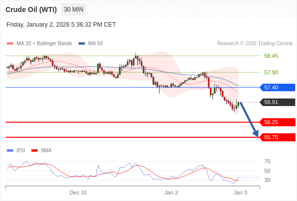 交易策略: 在 57.40 之下,看跌,目标价位为 56.25 ,然后为 55.75 。