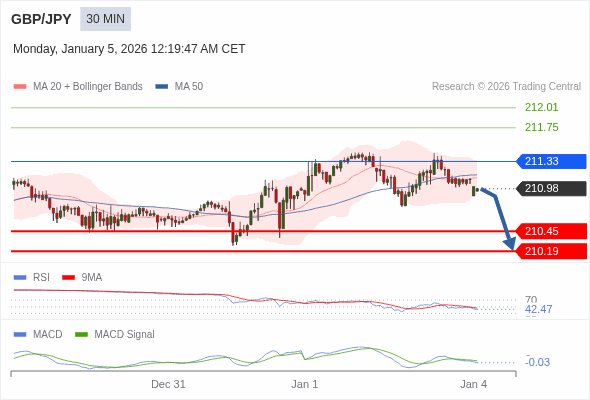 英镑/日元 当日内 : 看跌,在 211.33 之下。