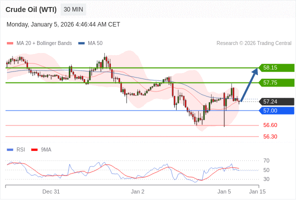 在 57.00 之上,看涨,目标价位为 57.75 ,然后为 58.15 。
