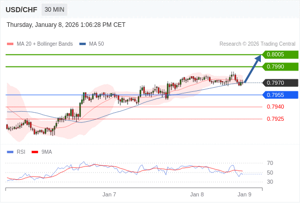 美元/瑞郎 当日内: 在0.7955之上,看涨。