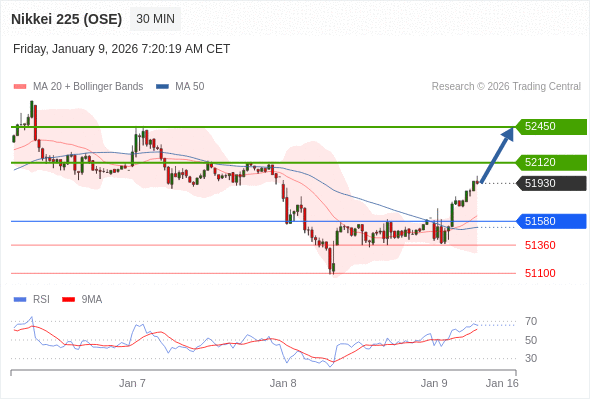 在 51580 之上,看涨,目标价位为 52120 ,然后为 52450 。