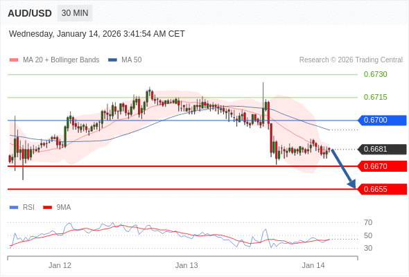 在 0.6700 之下,看跌,目标价位为 0.6670 ,然后为 0.6655 。