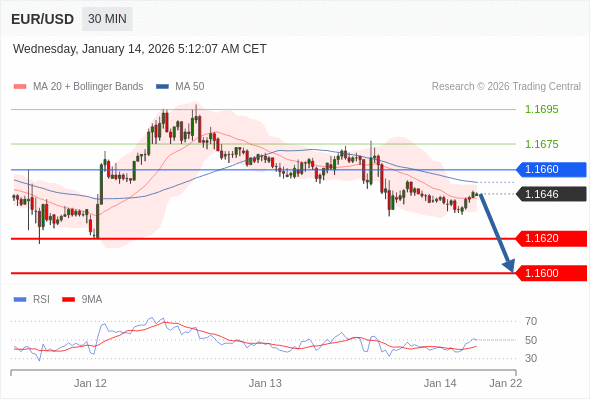 交易策略: 在 1.1660 之下,看跌,目标价位为 1.1620 ,然后为 1.1600 。