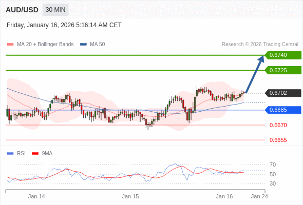 在 0.6685 之上,看涨,目标价位为 0.6725 ,然后为 0.6740 。