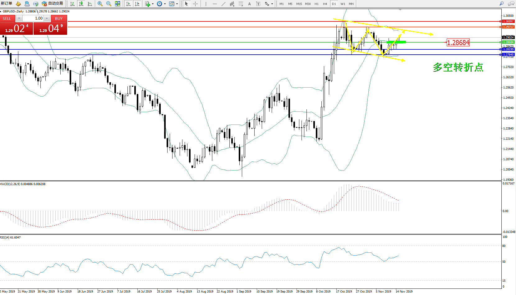 交易策略:1.28684上方看涨,目标1.29717、1.30097