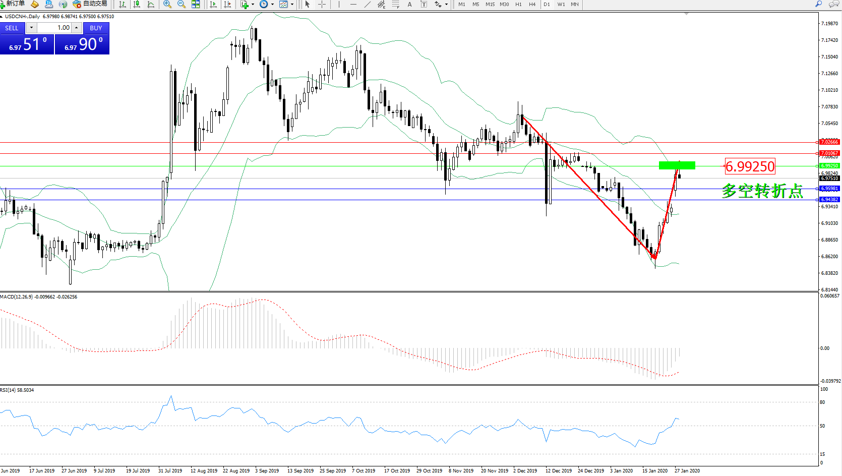 交易策略:6.99250下方看跌,目标6.95981、6.94382