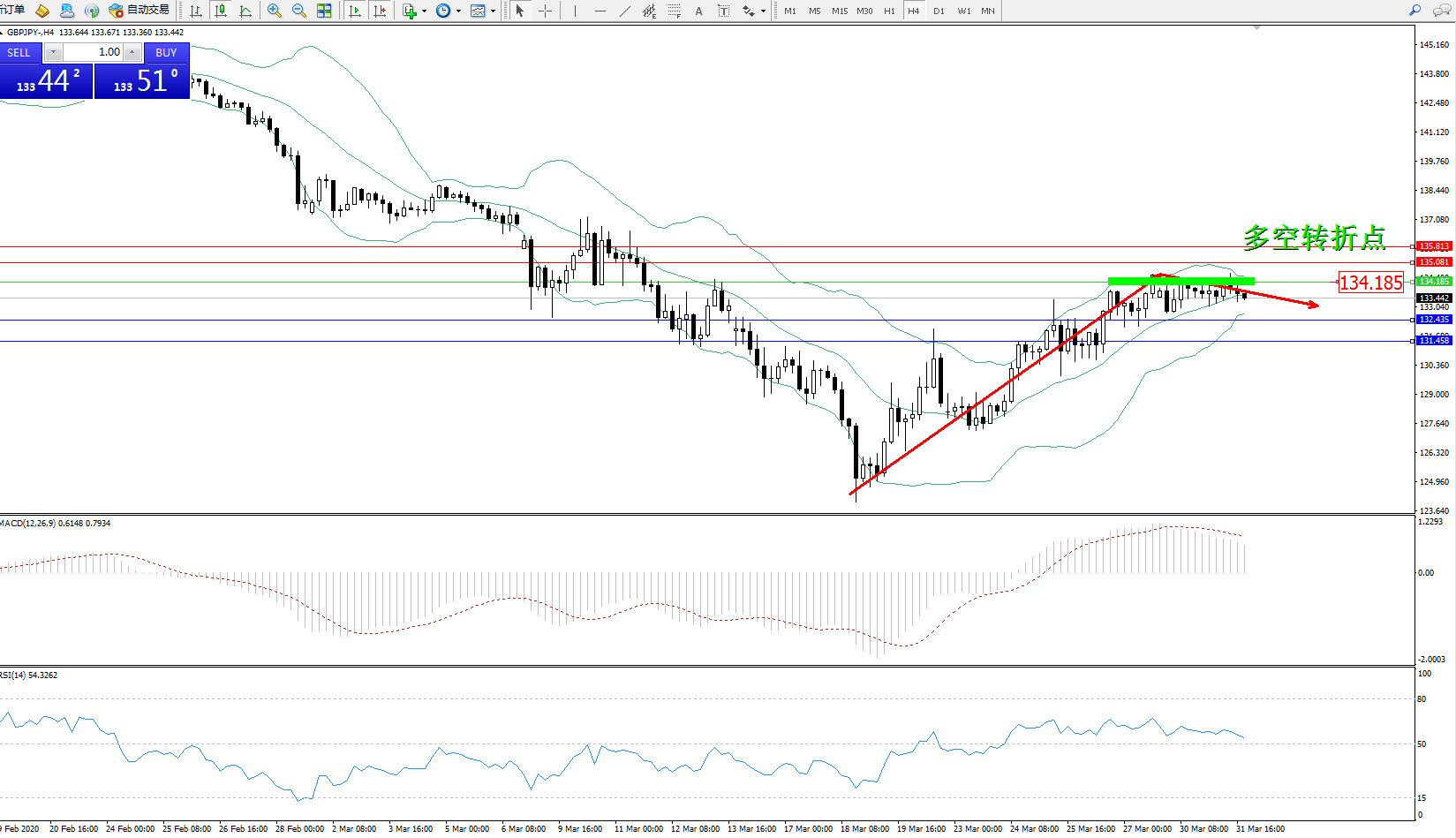 交易策略:134.185下方看跌,目标132.435、131.458