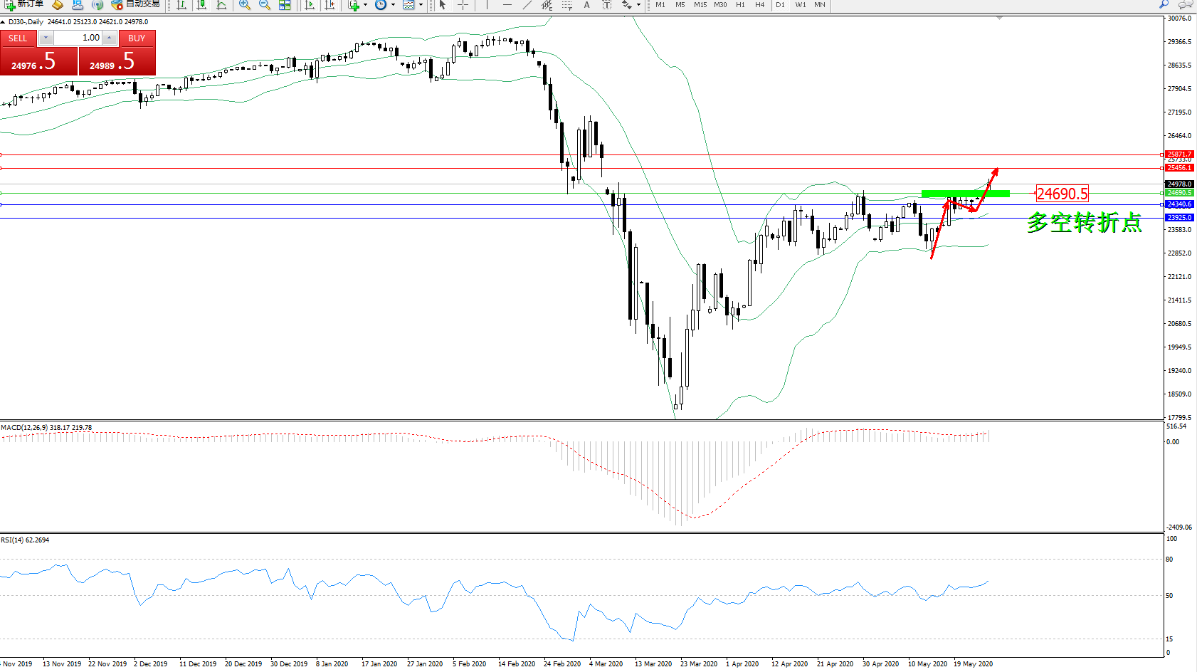 道琼斯指数5月26日(周二)收盘上涨530.00点,涨幅2.17%,报24995.11点。美股高开高收,道指初步收涨超2%,金融板块领涨,瑞幸咖啡初步收涨约50%。因欧美国家逐步放松封锁措施,市场憧憬经济复苏,股市的上涨反映了市场风险偏好的回归,打压了美元的避险需求;美联储发布4月贴现率会议纪要,各区域联储银行理事会在4月赞成维持贴现率不变,认为前景存在相当大的不确定性。美国一些州逐步放开了限制措施,但是美国经济逐步复苏的步伐也符合我们的观点,即要实现任何形式的正常化美国都任重道远。