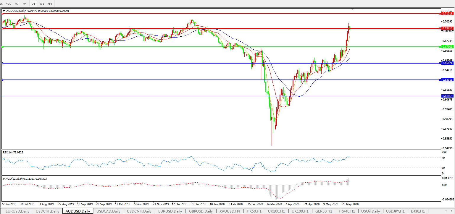 技术面简析:日图均线呈有序多头排列,汇价冲击0.70关口未果开始回落,MACD运行于0轴上方且量能快速放量,RSI持续走升,预计汇价大概率将进一步上行。