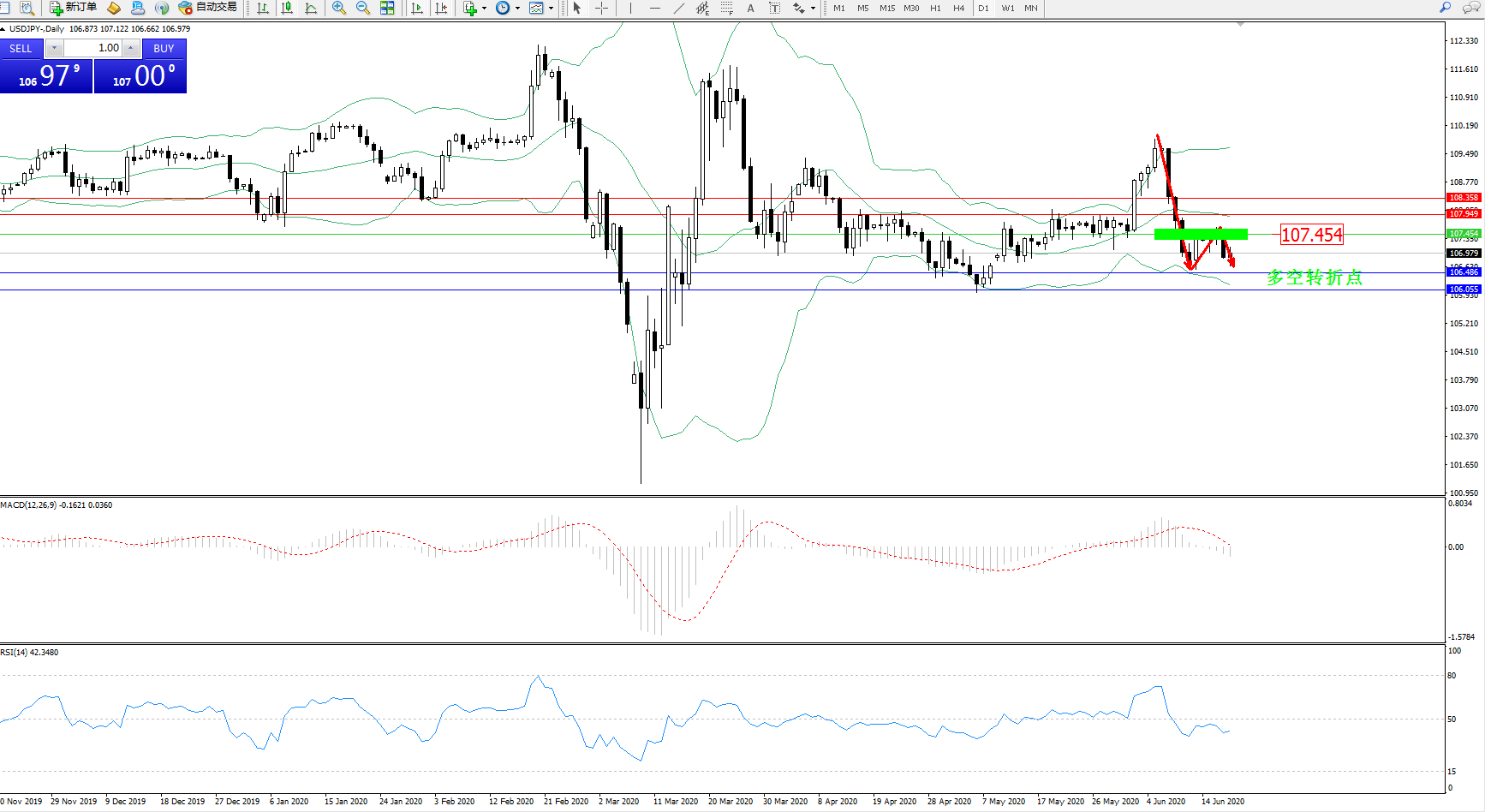交易策略:107.454下方看跌,目标106.486106.055