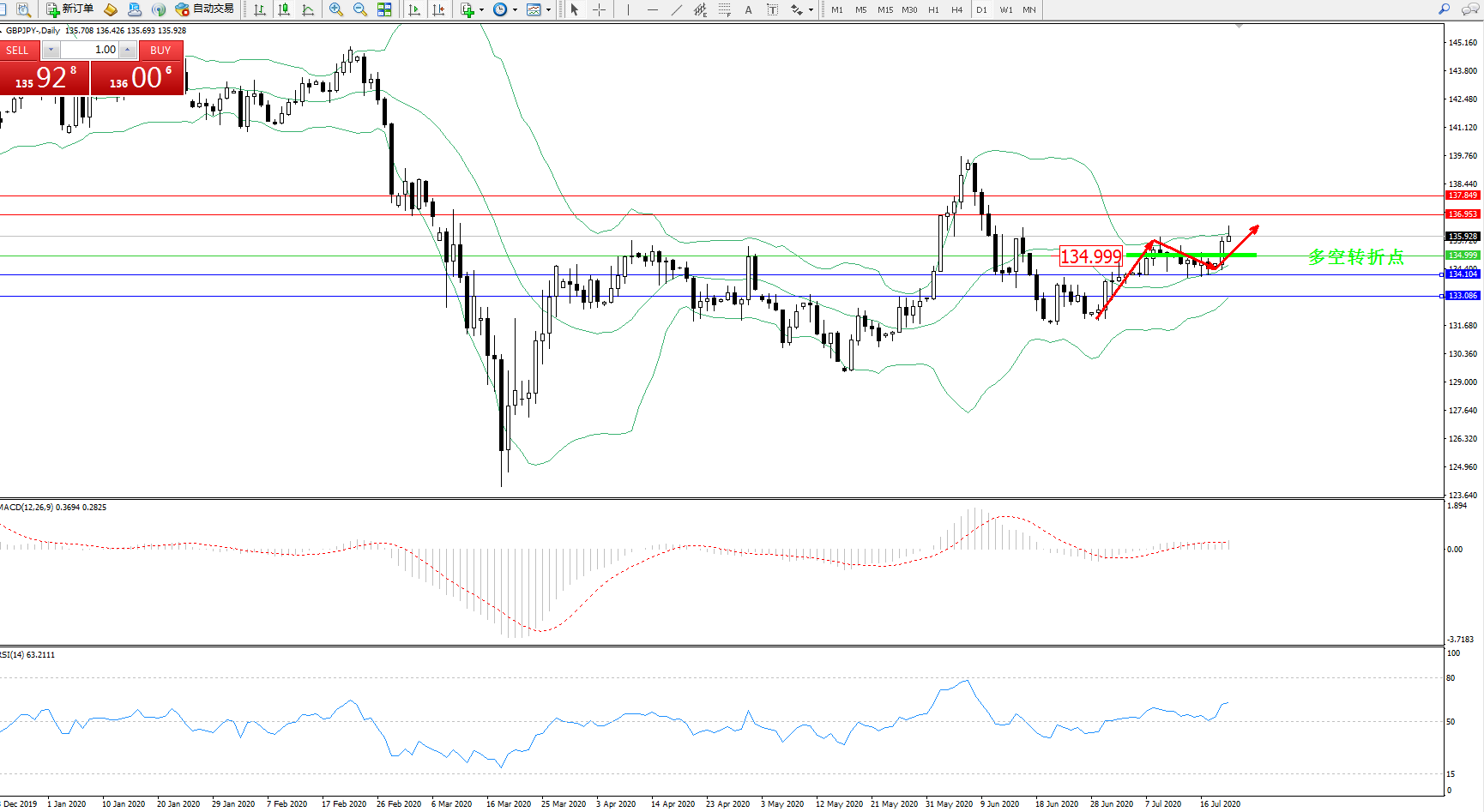 交易策略:134.999上方看涨,目标136.953、137.849