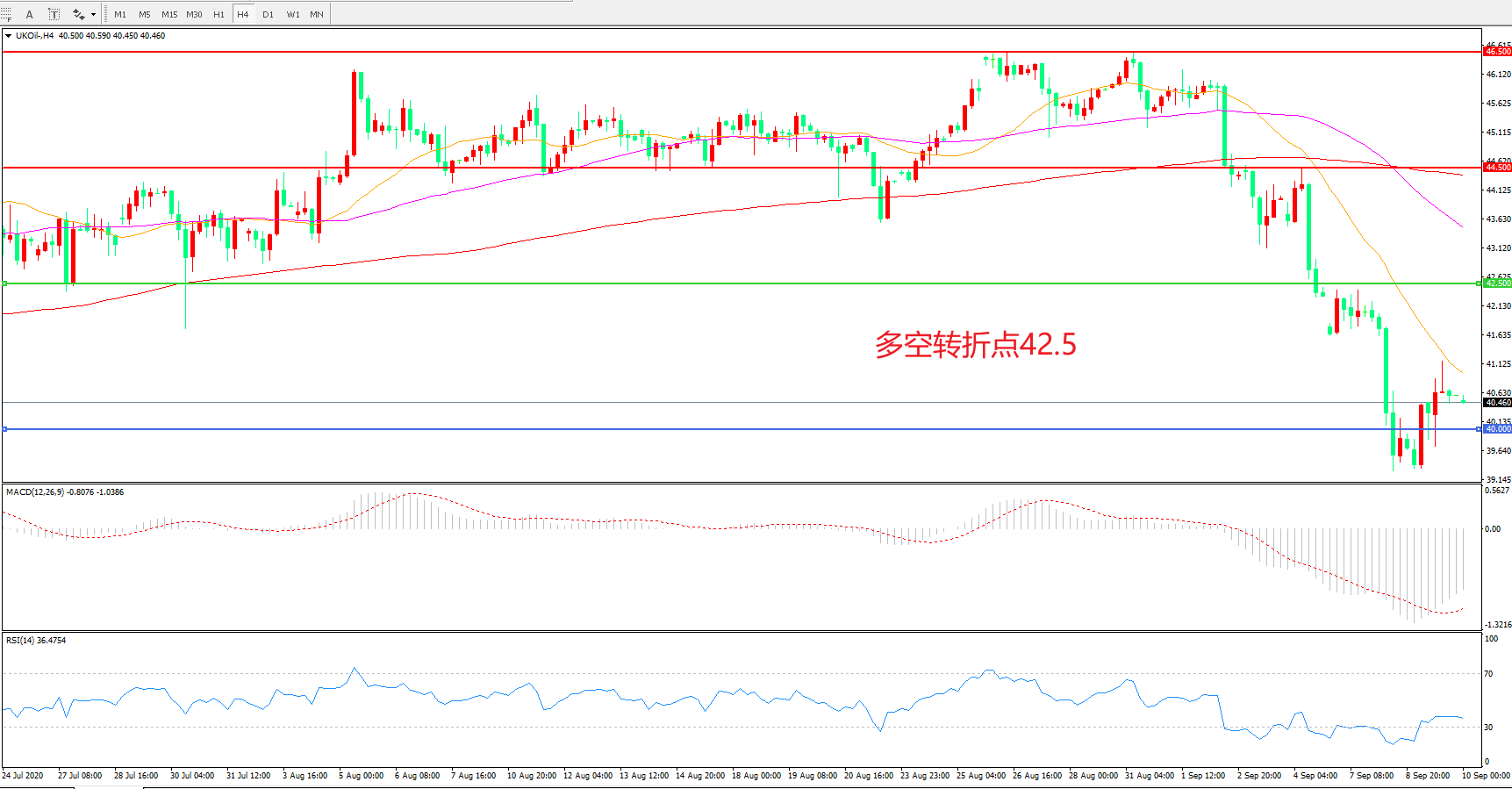 交易策略: 在42.50之下看跌,目标40.00 37.00