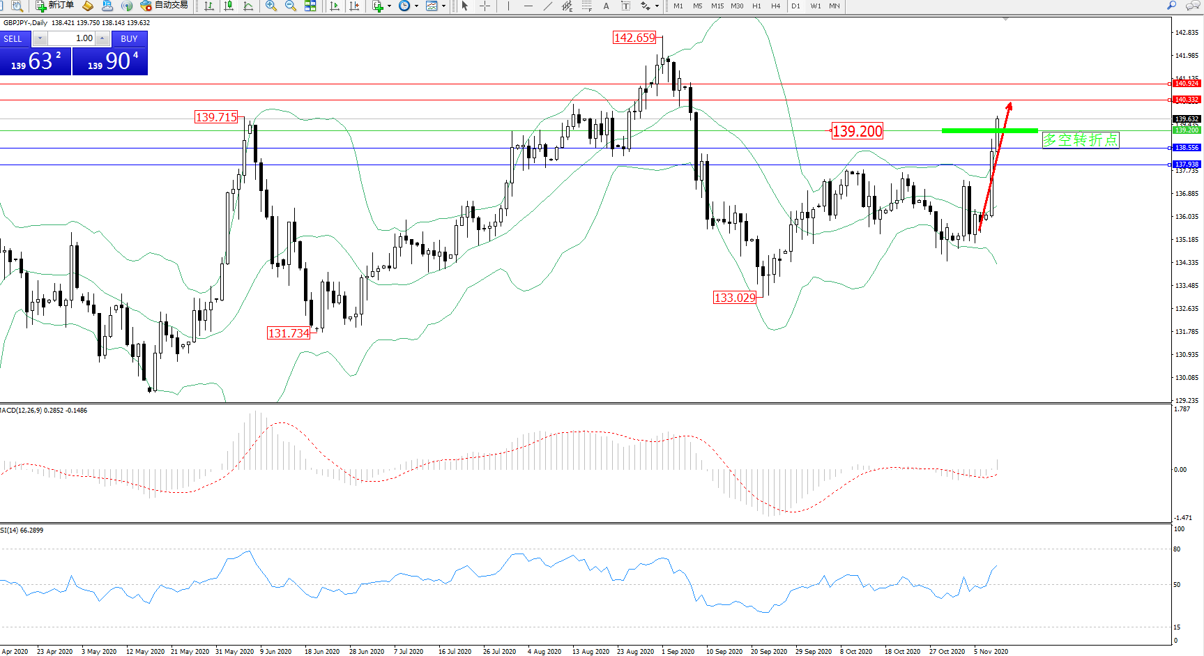 英镑兑日圆强势拉升至139.632附近震荡,英国政府宣布英格兰重新进入禁闭状态,至少到12月2日,不过可能会延长,已经促使英国央行预测第四季度国内生产总值(GDP)将再次收缩2%,而在2020年全年将进一步收缩11%,作为回应,英国央行和英国政府实施了进一步的“协调”刺激措施,政府也将“工作休假”计划延长至3月底,市场参与者目前似乎并不过分担心货币融资带来的下行风险,英国央行正在帮助政府以创纪录的低收益率借入资金。英国与欧盟达成贸易协议的前景仍是潜在积极催化剂,但鉴于英国基本面疲弱,任何升值的可持续性仍存在疑问。