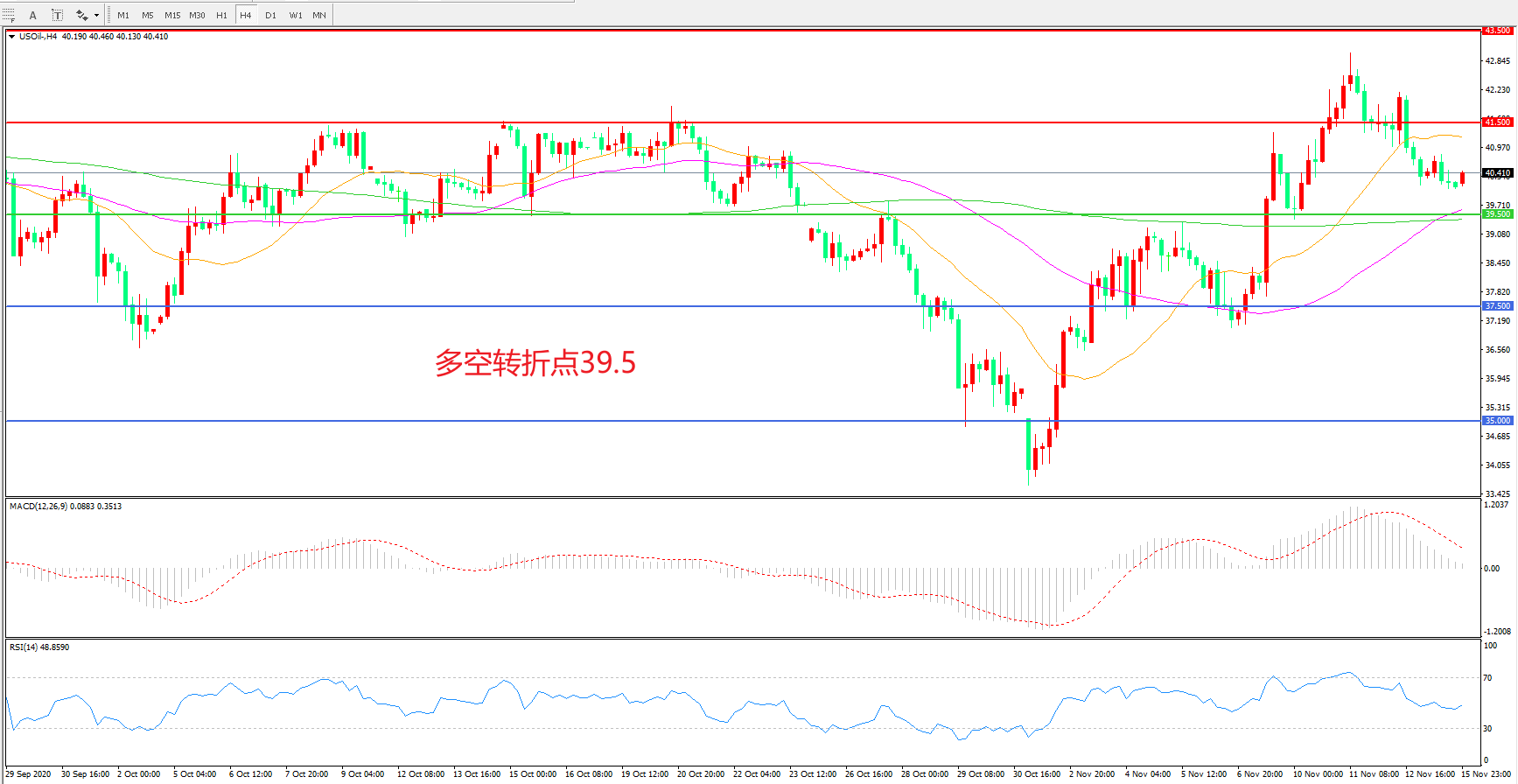 4小时图看,油价整体呈现冲高回落形态,短期走势陷入震荡,41.5成为上方阻力,39.5成为短期支撑,短期均线逐渐走平,MACD红柱减少,RSI指标走平,日内震荡上行概率较大。