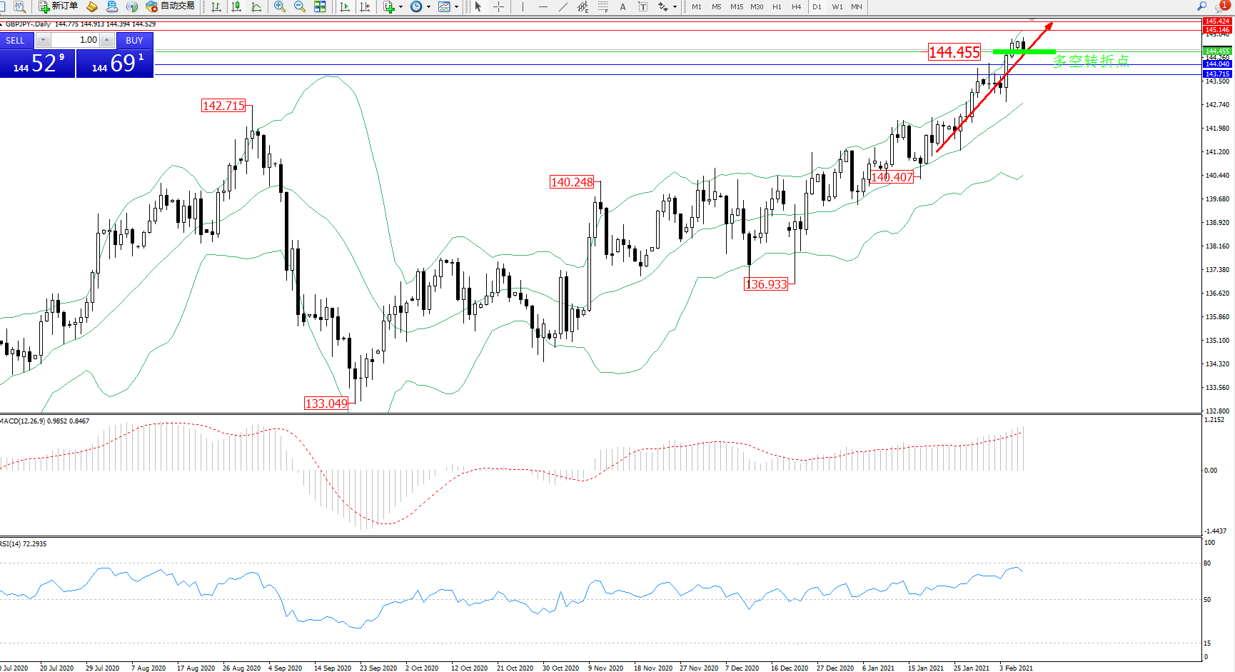 交易策略:144.455上方看涨,目标145.146、145.424