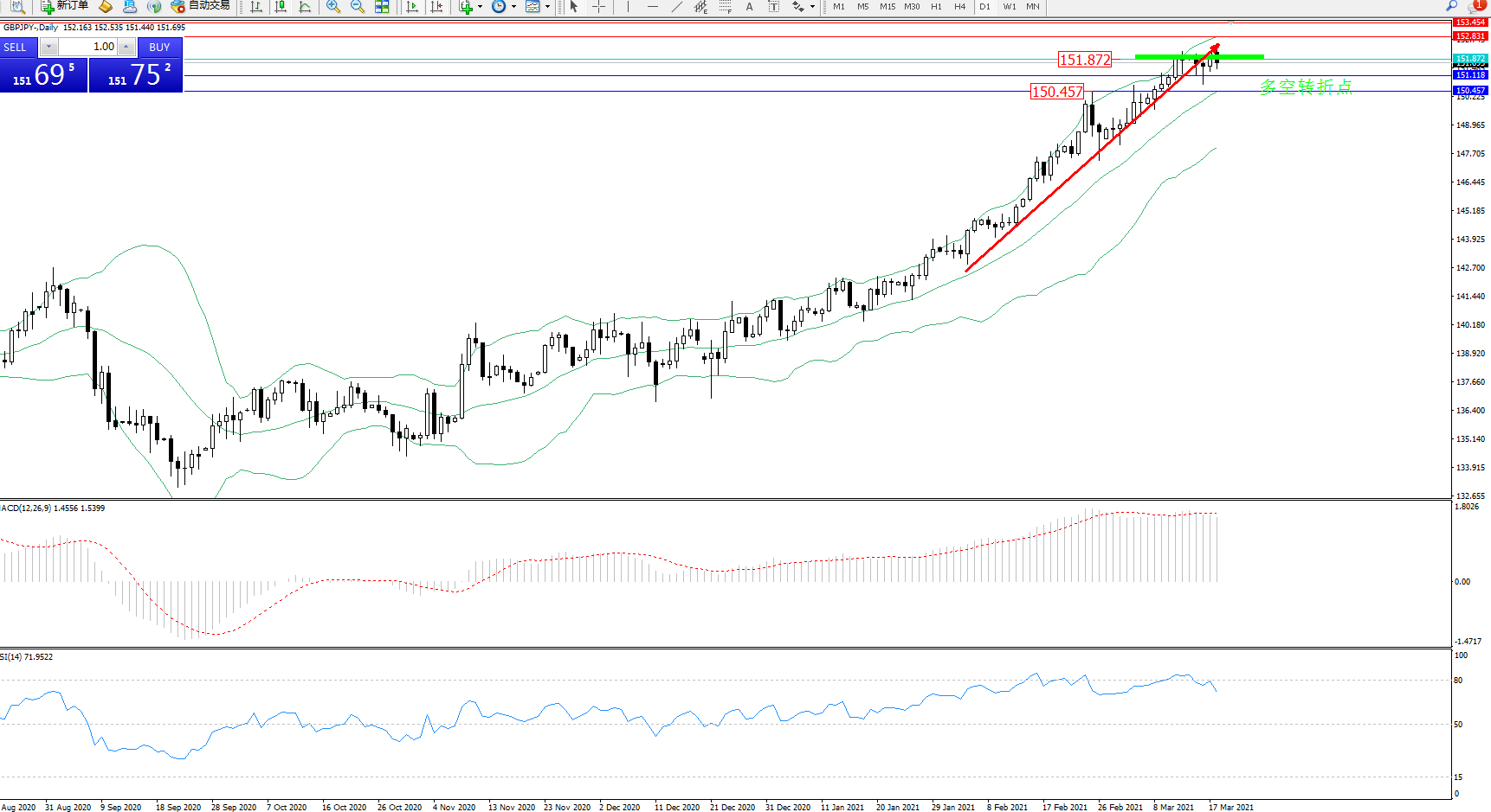 交易策略:151.872下方看跌,目标151.118、150.457