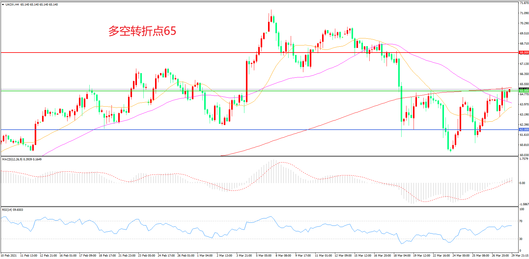 4小时图看,油价回踩21周期均线后后再度拉升,整体表现有所回暖,65美元成为多空分水岭,55周期均线形成下方支撑,MACD红柱增加,RSI指标走平,日内震荡上行概率较大。