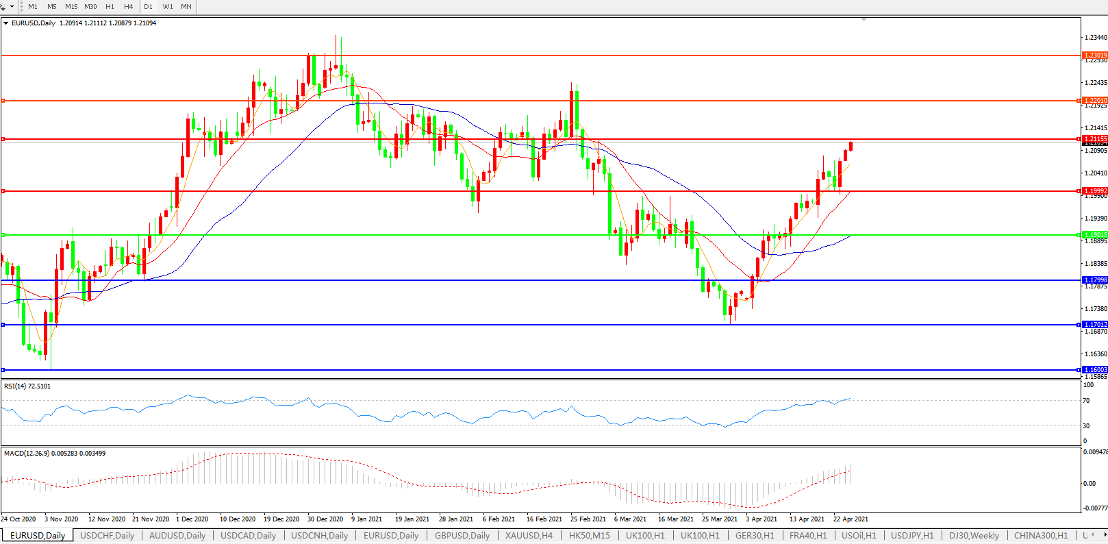 技术面简析:日图均线呈多头排列,汇价持续发力上行,MACD上穿0轴且量能有持续放量迹象,RSI持续上攻,预计短期汇价大概率将进一步上行。