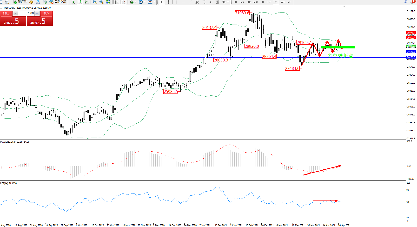 香港恒生指数4月27日(周二)收盘下跌11.29点,跌幅0.04%,报28941.54点;港股指数全天小幅震荡,大市成交额萎缩至1454亿港元,南下资金净流入21.31亿港元。恒生科技指数涨0.37%报8516点。大型科技股美团涨2.6%,阿里巴巴涨近1%,腾讯、京东小幅收跌;燃气股、航空股继续下挫,光伏股、中资券商股等走低明显。南下资金今日净买入港股8.34亿港元,连续8日增持港股。药明生物、香港交易所、美团-W净买入额位列前三,分别获净买入14.76亿港元、5.08亿港元、2.87亿港元。净卖出前三个股为腾讯控股、小米集团-W、思摩尔国际,分别遭净卖出4.94亿港元、2.62亿港元、1.06亿港元。香港特区政府统计处公布,今年3月份本港整体出口和进口货值分别上升26.4%及21.7%,均远胜市场预期。今年3月份商品整体出口货值为4091亿港元,按年上升26.4%,商品进口货值为4361亿港元,按年上升21.7%。3月份录得有形贸易逆差270亿港元,相等于商品进口货值的6.2%。