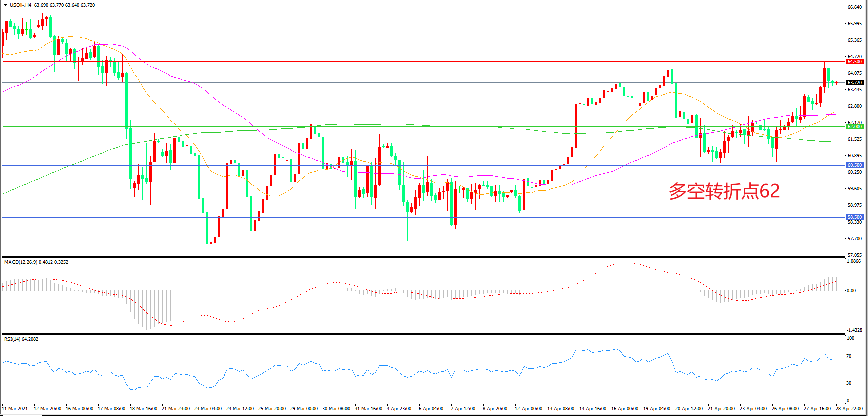 4小时图看,油价长阳拉升,触碰64.5美元后再次回落,短期涨势暂缓,形态上依然呈现偏多格局,均线系统粘合形成下方支撑,MACD红柱增加,RSI指标走平,日内震荡上行概率较大。