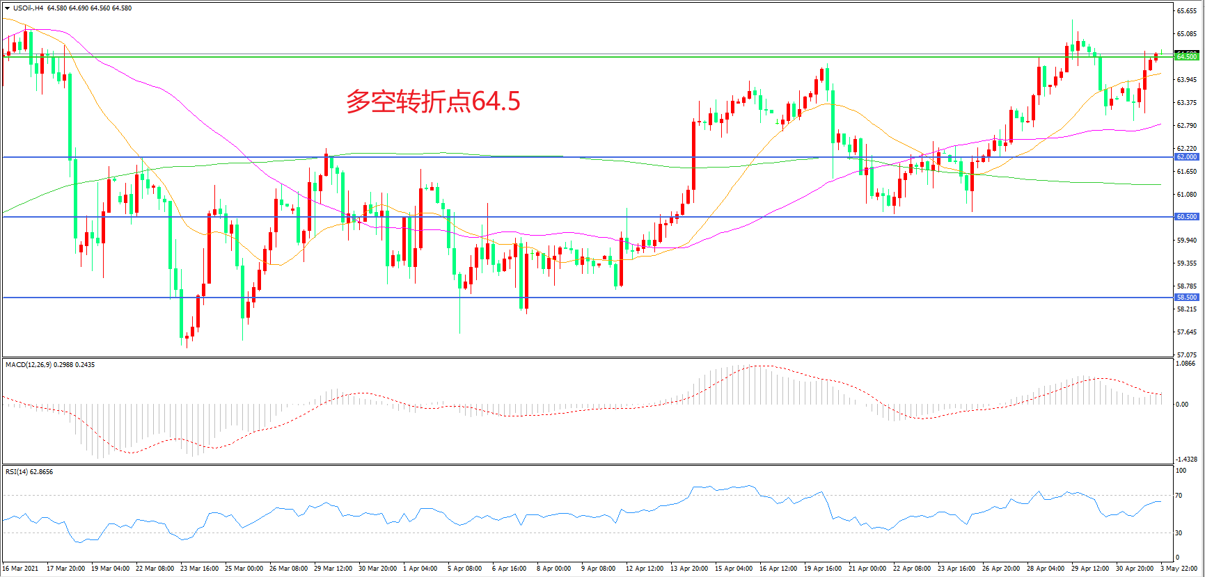 4小时图看,油价回踩55周期均线后再度攀升,市场行情有所回暖,64.5成为短期多空分水岭,均线系统走平,MACD红柱增加,RSI指标向上,日内震荡上行概率较大。