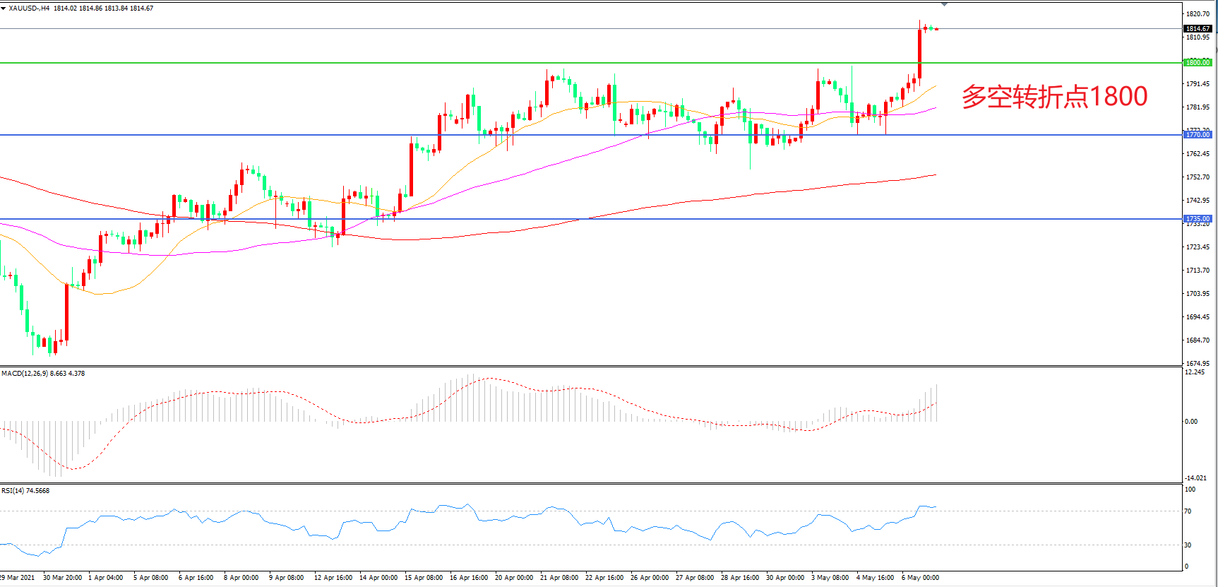 周四(5月6日),在非农就业报告公布前,市场对经济走强的期待压倒了对通胀上升的担忧,美元指数跌近0.5%,美债收益率小幅波动,现货黄金高歌猛进,在神秘大单的助推下一举突破1800关口,收报1814.34美元/盎司。如果黄金成功站稳1800美元一线,将为进一步上涨开辟巨大空间。