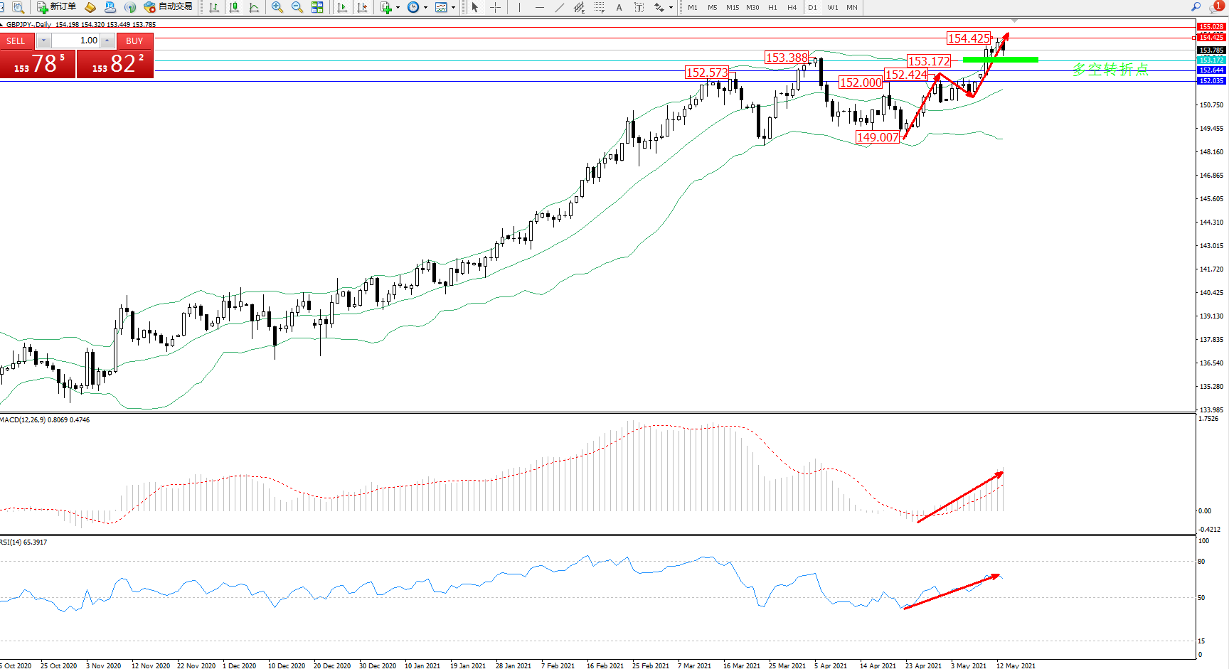 交易策略:153.172上方看涨,目标154.425、155.028