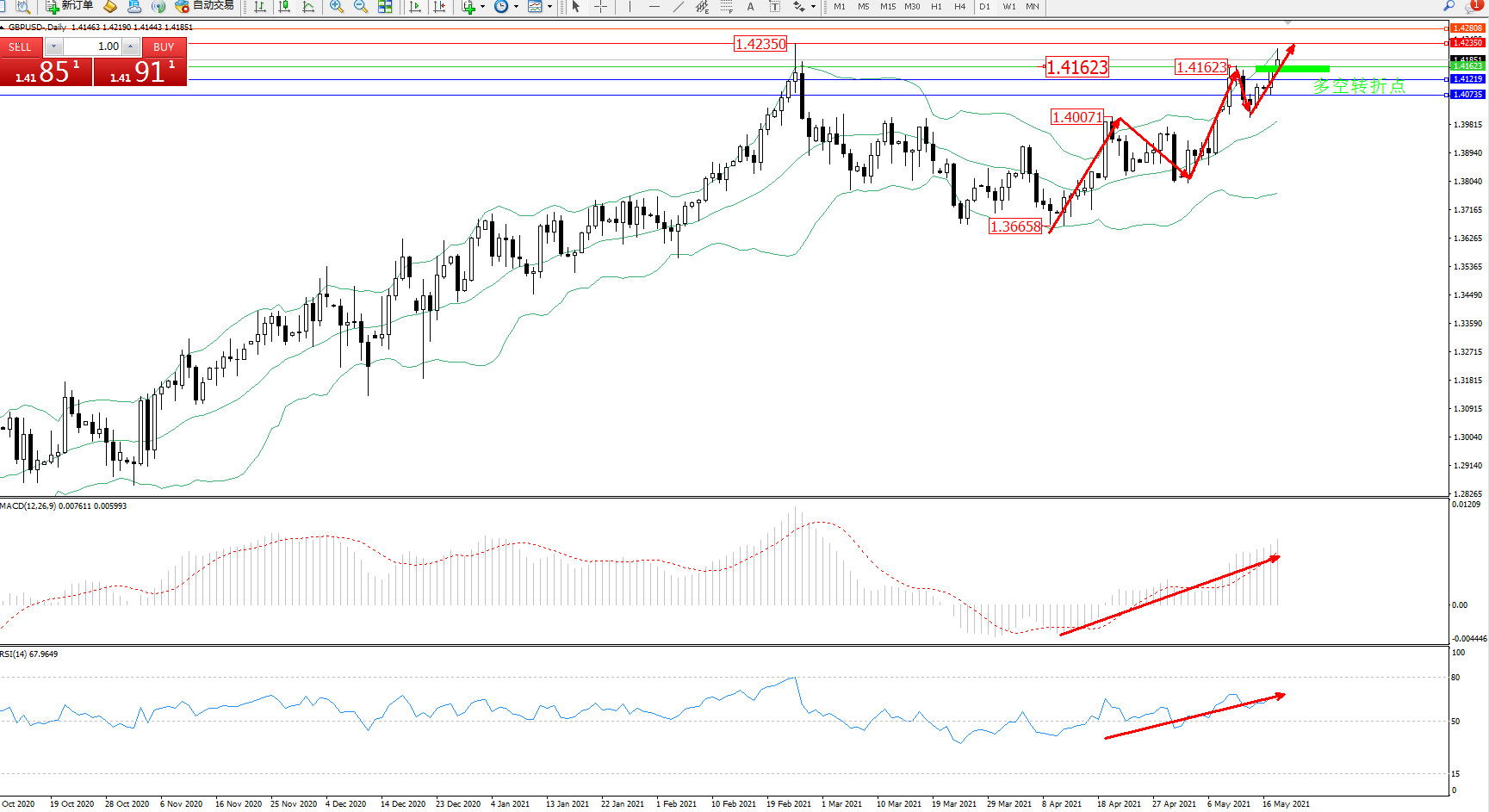 交易策略:1.41623上方看涨,目标1.52350、1.42808