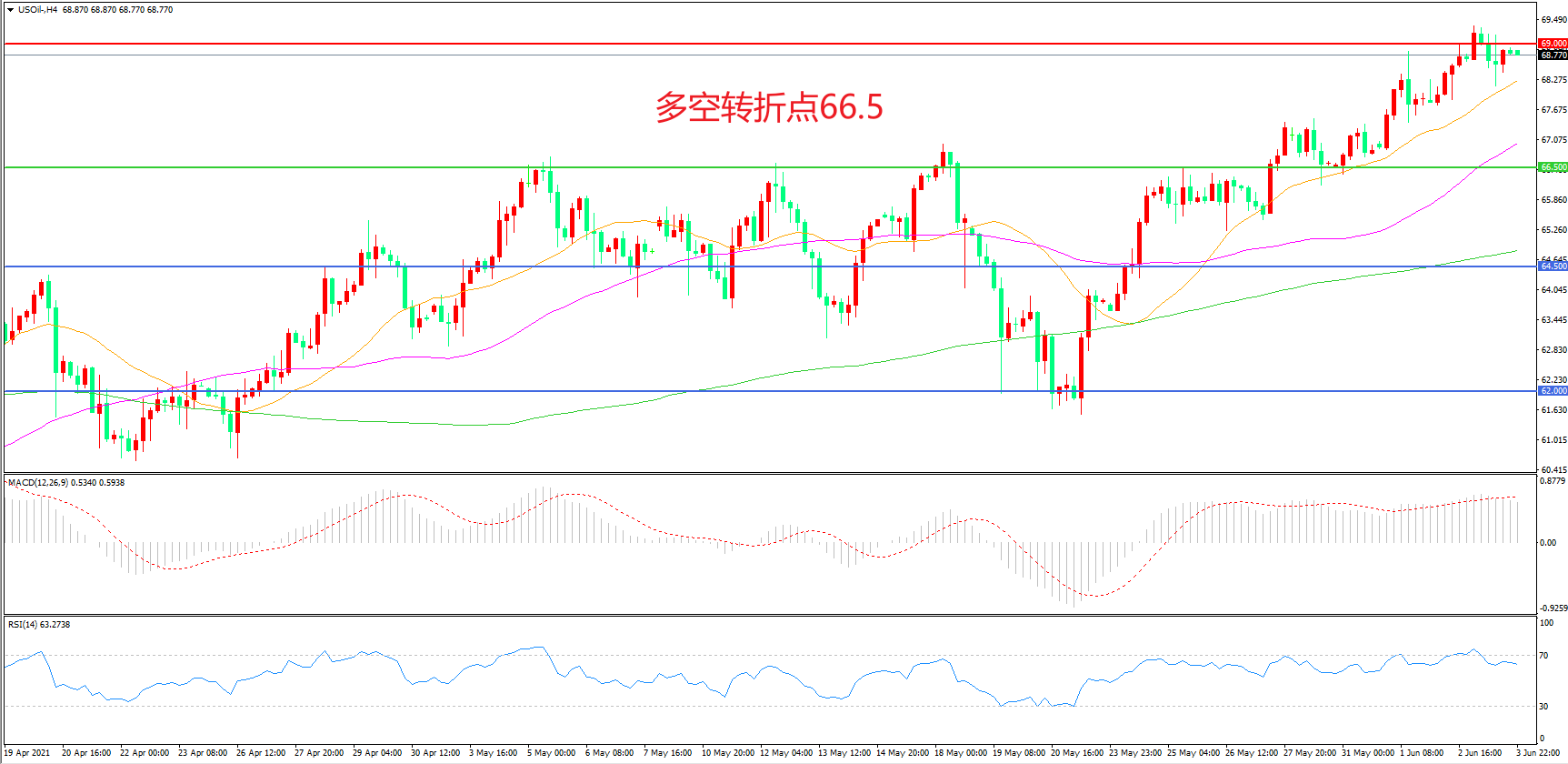 交易策略:在66.50之上看涨,目标69.00 72.00