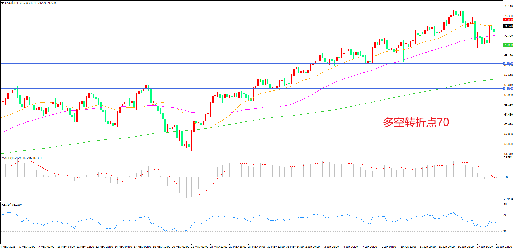 4小时图看,油价先跌后涨,回踩70美元后震荡上行,短期表现相对强势,均线系统走平,MACD红柱缩短,RSI指标走平,日内延续震荡概率较大。