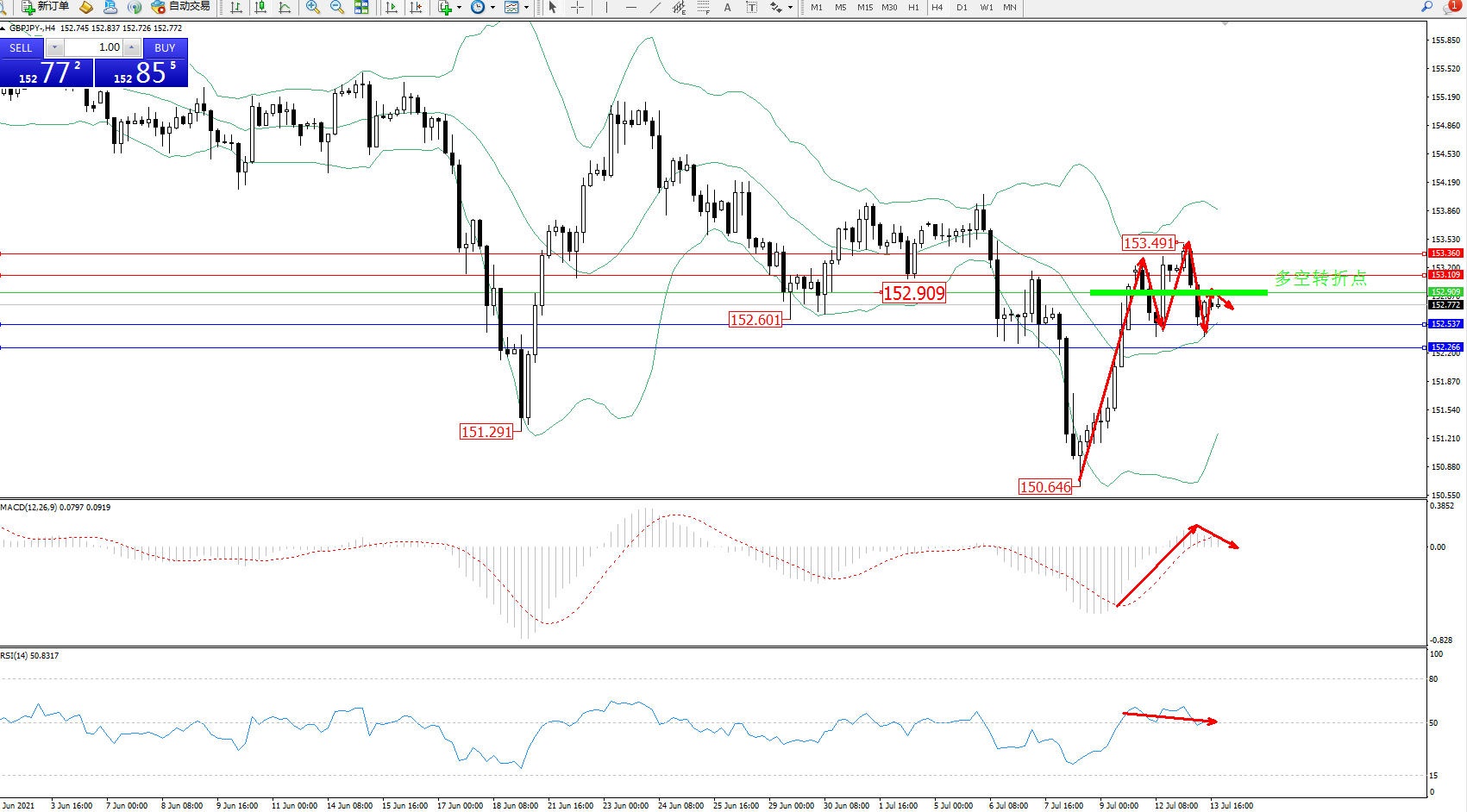 交易策略:152.909下方看跌,目标152.537、152.266