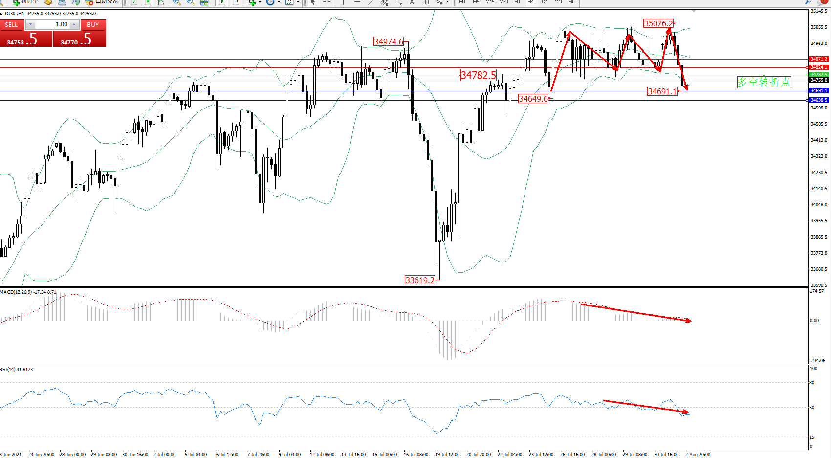 道琼斯指数DJ30——4小时K线图显示: