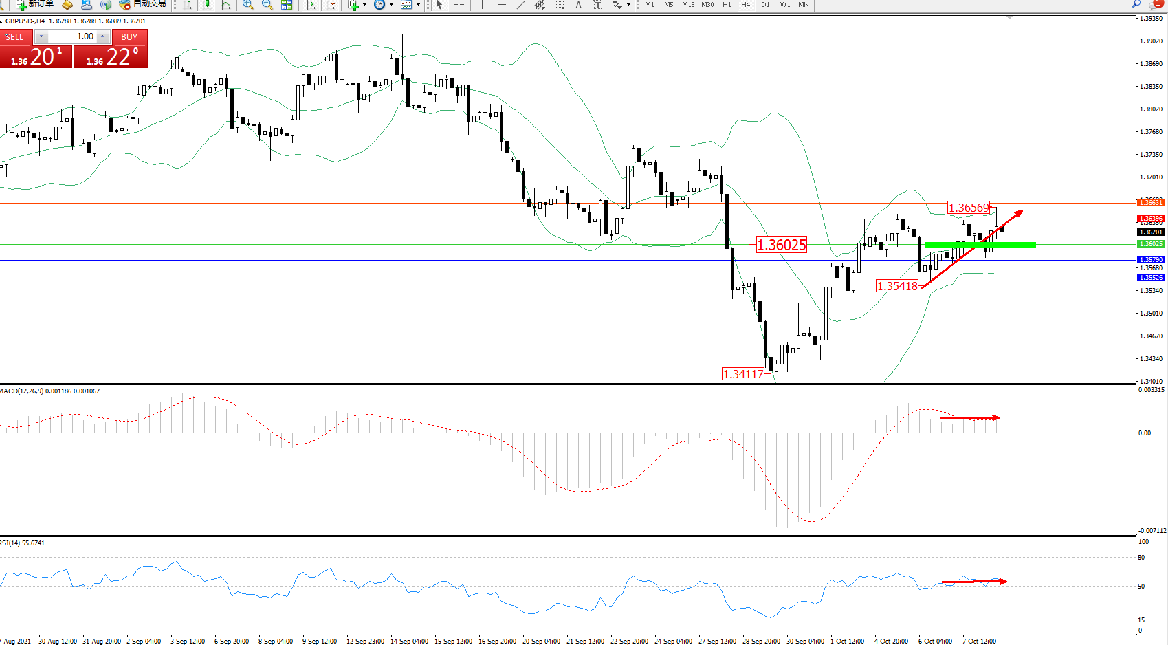 交易策略:1.36025上方看涨,目标1.36396、1.36631