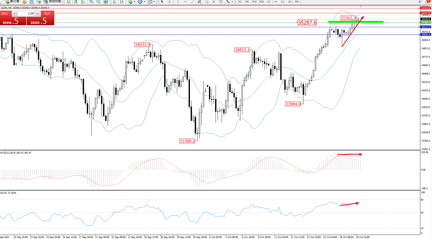 技术点评:多头动力延续布林带指标通道中上轨区间持续震荡上扬,高位抵达35362位置节点后开始短期整理,多头动力有进一步向上移动态势,布林带指标呈收口走势不断上移中,MACD指标处于多头区域维持整理平移,RSI指标处于多头区域高位维持弱势徘徊中;