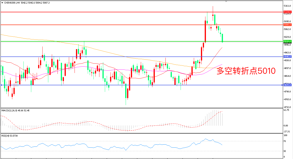 4小时图看,沪深300高开后震荡回落,短期走势出现调整,但收盘价依然前日高点,5080成为多空分水岭,MACD红柱增加,RSI指标走平,日内震荡上行概率较大。